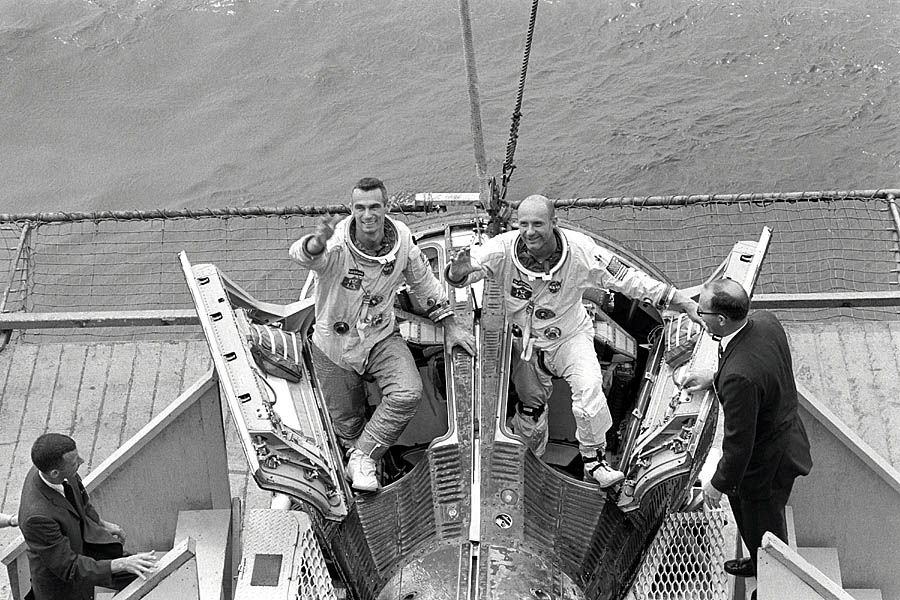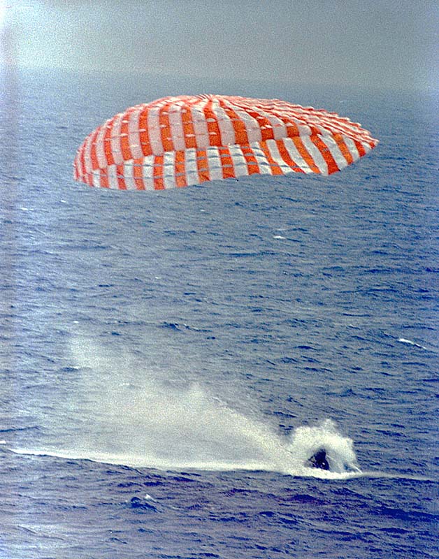 "Máte nás v dohledu?" zeptal se Stafford posádky letadlové lodi Wasp. Odpověd' zněla:"Celý svět vás má v dohledu!" Televizní kamery vysílaly záběry sestupující kosmické lodi, jak se kolébá pod pruhovaným padákem.