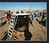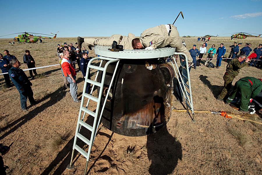 Byla to také výzva pro plánování mise, protože posádka stanice a posádka raketoplánu musejí mít v tomto případě rozdílné denní režimy.Za normálních okolností jsou po odpoutání od ISS všichni kosmonauti usazeni do svých křesel v přistávacím modulu, nicméně tentokrát se Paolo Nespoli vydal do servisního modulu lodi Sojuz a po patnácti minutách velitel Dmitrij Kondraťjev ručně zastavil Sojuz ve vzdálenosti asi 200 metrů od stanice. Následovalo otočení celé orbitální stanice pomocí reaktivních motorů tak, aby na ni byl ze Sojuzu co možná nejlepší výhled, a Paolo Nespoli mohl pořídit sérii zcela unikátních snímků. Následně měl Nespoli pouhých 25 minut, aby vyjmul z fotoaparátů flashové paměti, přesunul se do návratového modulu, opět bezpečně uzavřel průlezy mezi servisním a návratovým modulem (servisní modul zůstává na oběžné dráze a zaniká v atmosféře) a usadil se do svého křesla. Dmitrij Kondraťjev následně provedl separační zážeh reaktivních motorů lodi Sojuz a následně nasměroval návratový modul k přistání v Kazašské poušti. Návratový modul úspěšně přistál v úterý 24. května ve 4:28 SELČ. Podle sdělení ruských úřadů trojice přestála návrat na Zemi dobře, modul dopadl v předem stanoveném prostoru východně od kazašského města Džezkazgan. |